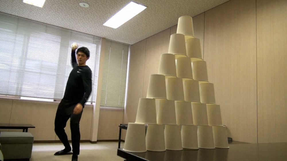 紙コップチャレンジに挑戦し、奥川超えの20個に成功した佐々木朗(球団提供)