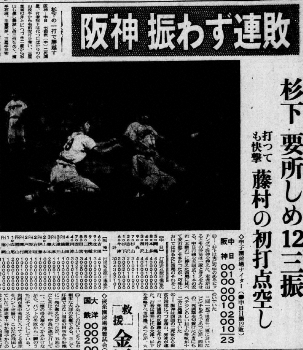 「ミスタータイガース」は、その晩年も抜群の存在感を誇っていた。敗戦翌日の紙面を開くと、2面トップで阪神―中日戦(甲子園)が扱われていた。メイン見出しは2失点完投の中日・杉下茂に譲ったが、サブ見出しは「藤村の初打点空し」。この「初打点」を挙げた打席が「猛虎最高の瞬間」だった。