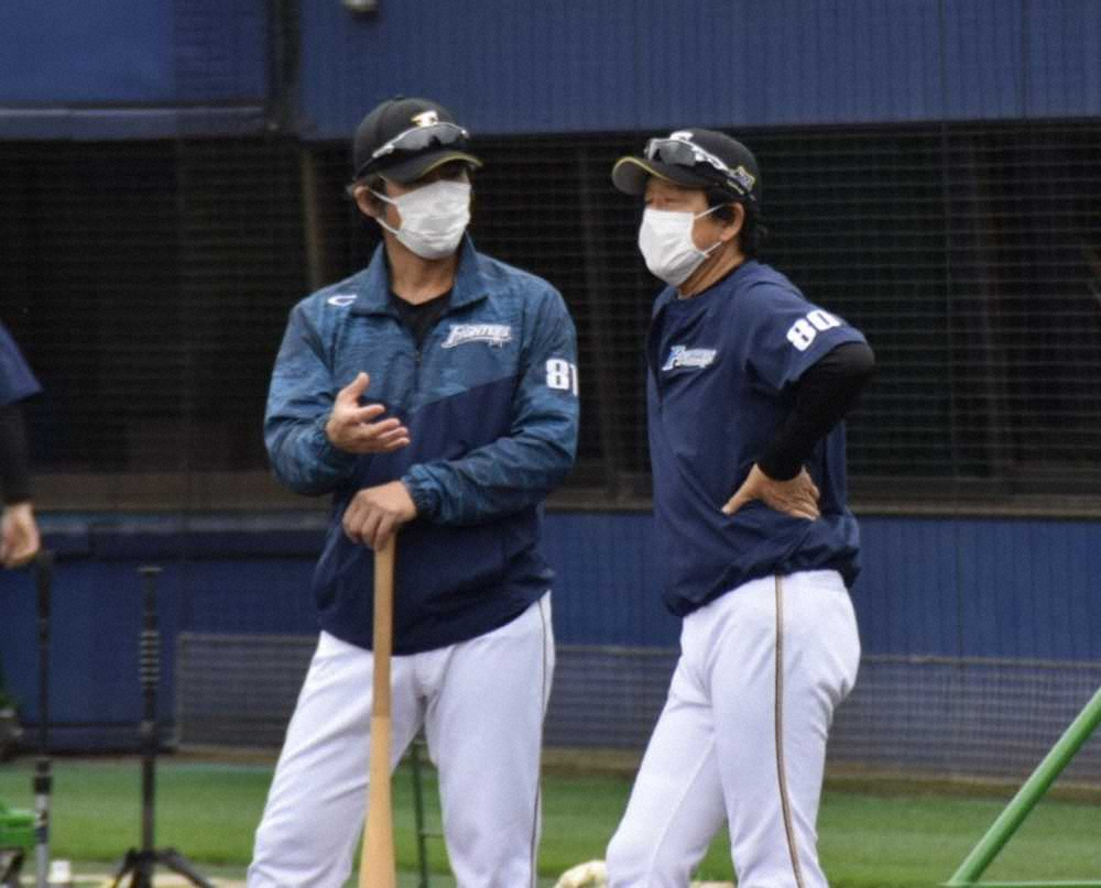 練習中にマスク姿で小笠原ヘッドコーチ兼打撃コーチ(左)と話し合う日本ハム・栗山監督