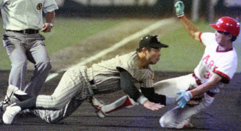 藤井打撃コーチのユニホームを借りて生還する掛布