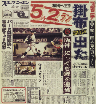一部カラー化が進んでいたスポニチの翌7日の一面には、赤見出しが躍った。「掛布出た 5号2ラン」。チームは6日の時点で62試合28勝33敗1分けの最下位に沈んでいたが、やはり「掛布」はビッグネームだった。まだシーズンは、折り返し前。まさか、この一発が現役最終本塁打になるとは、この時点では本人を含め誰も想像していなかったに違いない。