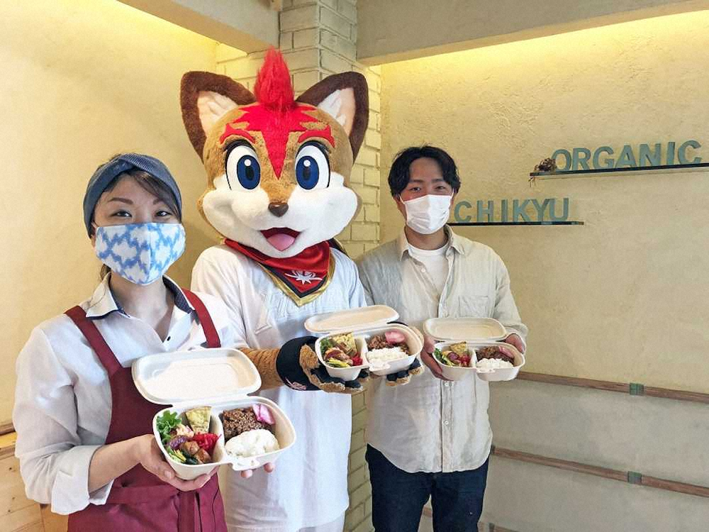 医療従事者に無償でオーガニック弁当を提供している札幌市の「Organic Kitchen Chikyu」のスタッフと球団マスコット・フレップ(中央)