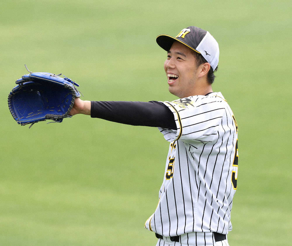 <阪神練習> 笑顔でキャッチボールをおこなう青柳(撮影・大森 寛明)
