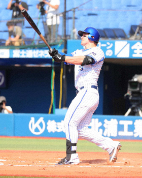続くのは3番のオースティンだ。低めの直球をすくい上げると、打球は左中間席を越えて場外へ消えた。2日楽天戦で人生初の場外弾を放ってから、わずか5日で2本目。「オフに妻と行ったトレーニングの成果が出ている」と胸を張った。モデルでトレーニングの知識も豊富なステファニー夫人は、4日に米国に帰国。ラミレス監督の計らいでオフをもらい羽田空港で見送った。異国での単身生活に「ベリーサッド」と本音も漏れたが「今シーズン中には帰ってくるので、それまで頑張るよ」と奮い立った。