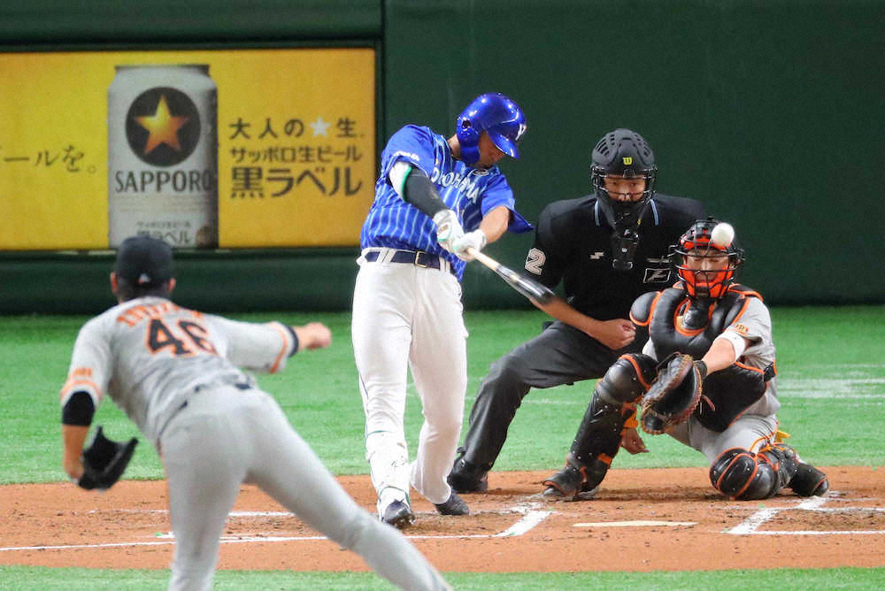 <練習試合 D・巨>初回1死一、二塁、鍬原(左)から適時二塁打を放つ佐野(撮影・木村 揚輔)