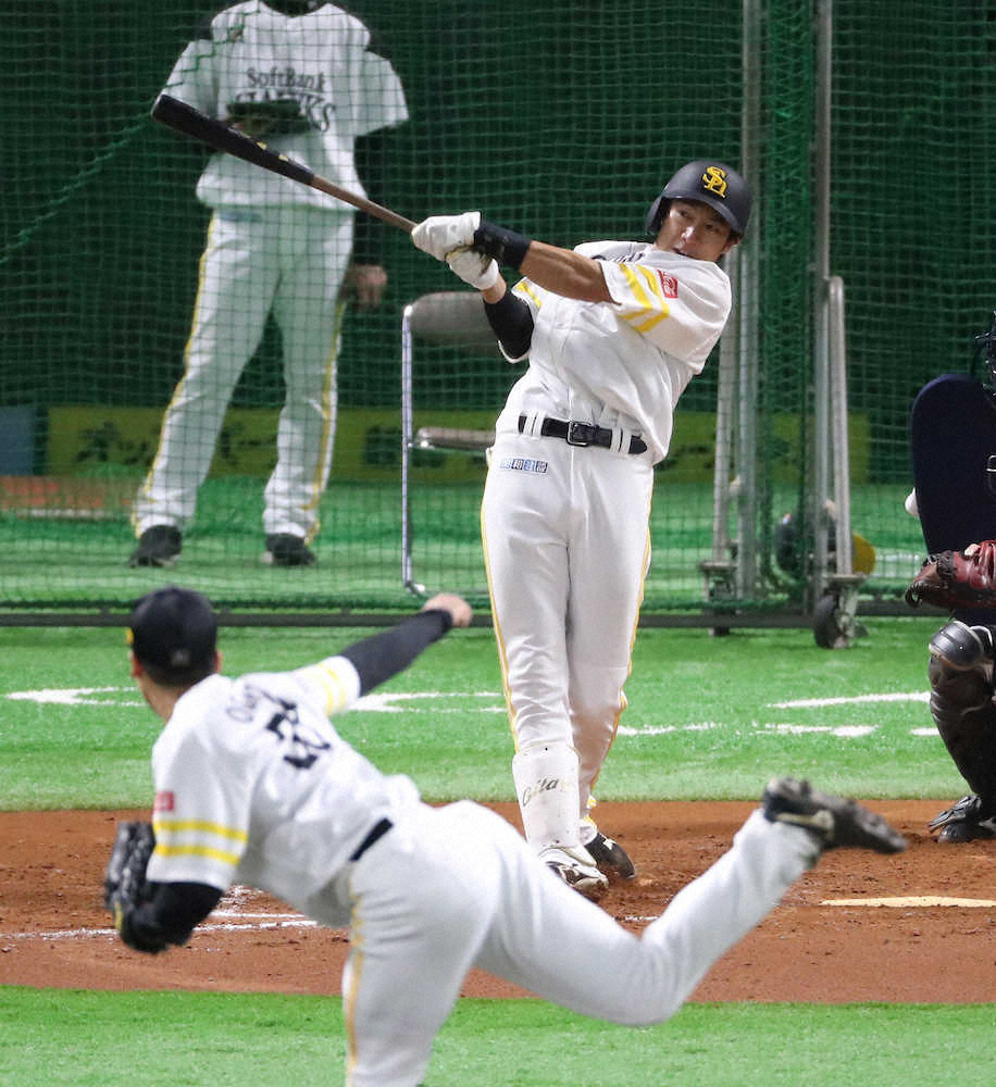 マウンドには今季支配下登録を勝ち取った売り出し中の右腕・尾形。「オラァ!」と声を上げて投じた148キロ角直球にクールかつ的確に反応した。柳田のシート打撃2打席目。1死二、三塁の設定でカウント2―2からの5球目を右翼スタンドへ叩き込んだ。
