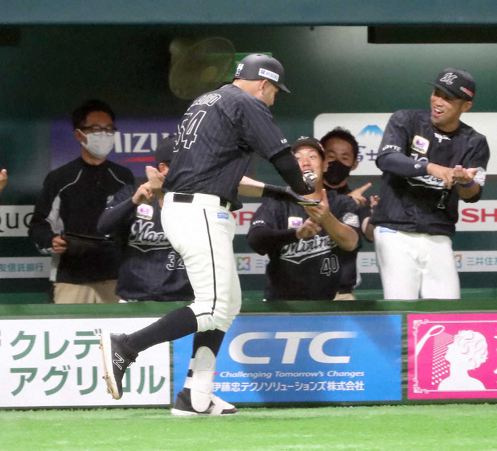 昨季は32本塁打をマークした。昨年9月8日のソフトバンク戦以来のアーチに「打ったのはスライダー。いい感じで打つことができた。この1本がチームの勝利につながってくれたらいいなと思う」と笑顔。ベースを回りながら恒例の寿司パフォーマンスを見せると、ベンチ前ではナインらも寿司に握りながら出迎えてくれた。「井口監督と鳥越ヘッドに寿司を握る前にはしっかりと手を洗うように言われたよ。スシ、さいGO!(さあ、行こう、最高)」とご機嫌だった。