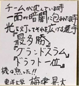 東洋大時代、寮の部屋に『チームが沈んでいる時、一面が暗闇に包まれた時、光を灯してそれを広げる選手』と書いた色紙を飾った。「親以外で一番の恩師。プロに入れたのも須江さんのおかげ」と尊敬してやまない宮城・秀光中時代の監督である須江航氏(現仙台育英監督)に教わったエースの条件だ。