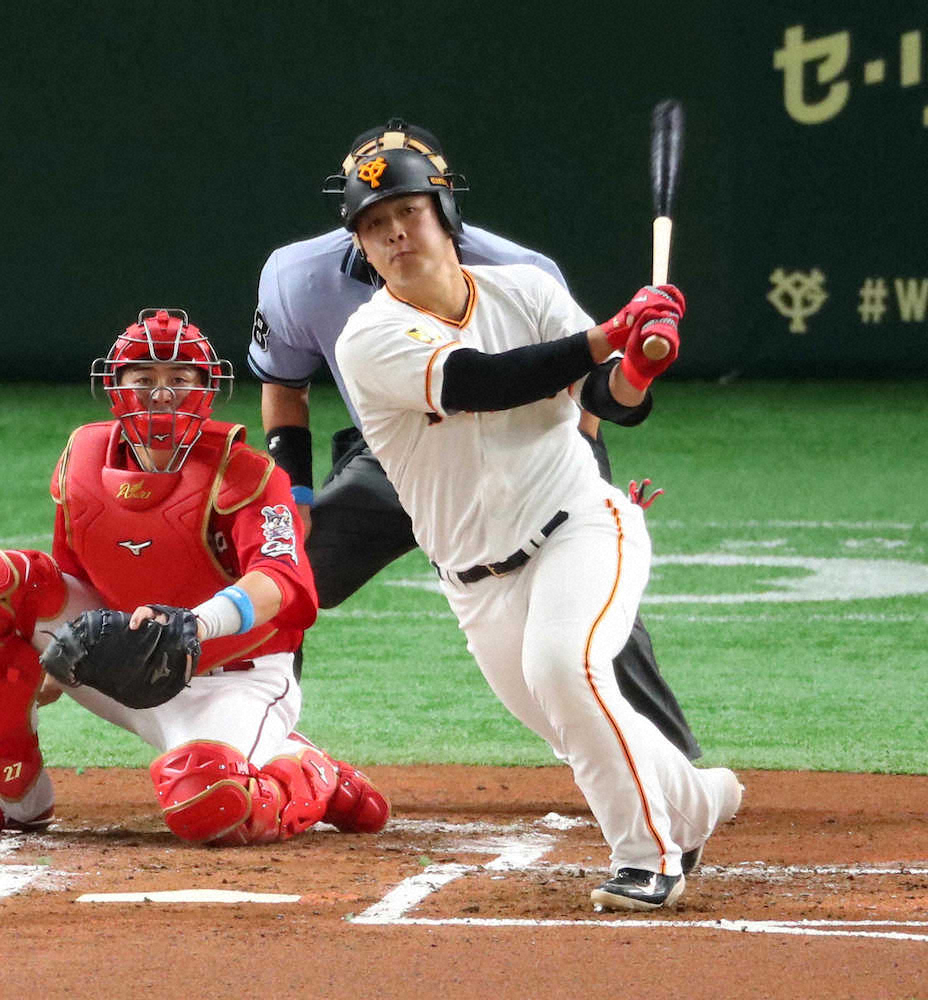 巨人・岡本が広島のK・ジョンソンから先制打を放った。昨季17打数1安打、打率・059、5三振の天敵。初回2死二塁からチェンジアップを中前にはじき返し「とにかくランナーを還すことができて良かった」と話した。