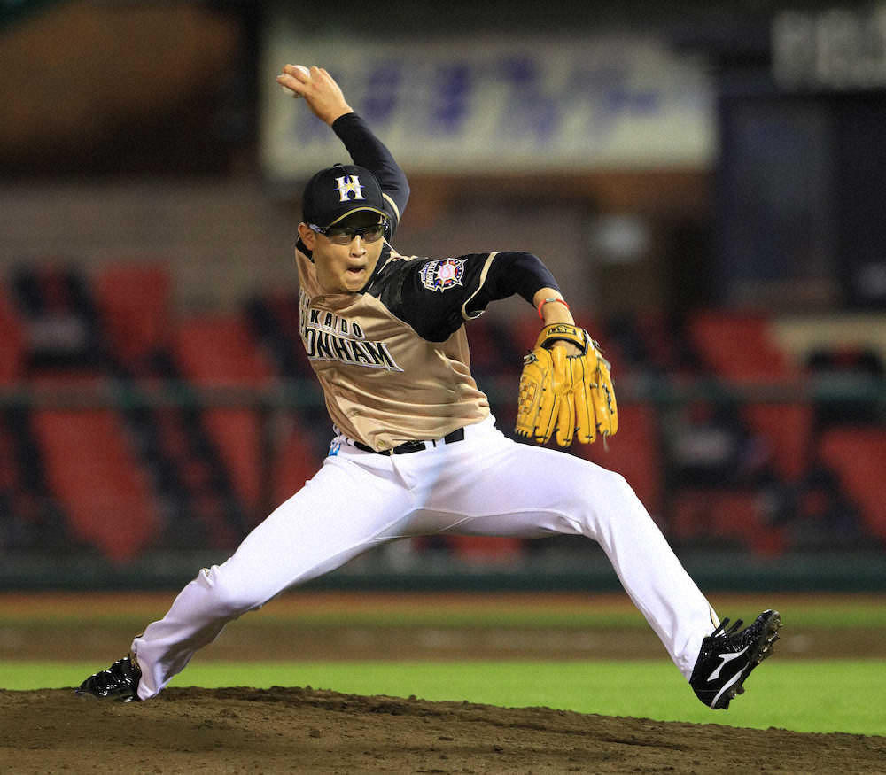 日本ハムのドラフト4位・鈴木健が無失点デビューだ。0―4の8回からプロ初登板。ロメロに二塁打こそ許したが、島内、太田を得意のスライダーで三振に仕留めた。