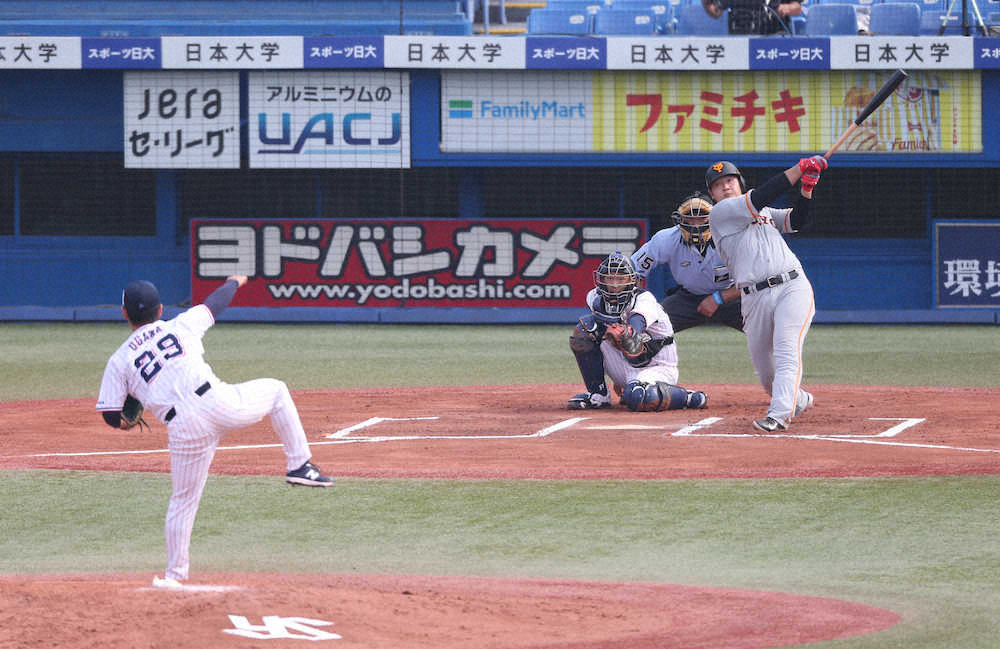 ヤクルト2点リードの6回、先頭で打席に入った岡本は、カウント1―0から真ん中低めの直球をセンター方向へ。高々と上がった打球はバックスクリーンに飛び込む3号ソロとなった。