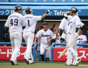初回に2点を先行も、小川が岡本、パーラに一発を浴びて6回途中4失点で降板。それでも直後の攻撃で、先頭の村上が代わったばかりの2番手・高木から1点差に迫る2号ソロ。4番の一発が打線に火をつけ、雄平、エスコバーの連打などで1死満塁とすると、代打・青木が3番手・宮国から左中間へ2点適時二塁打を放って逆転に成功した。