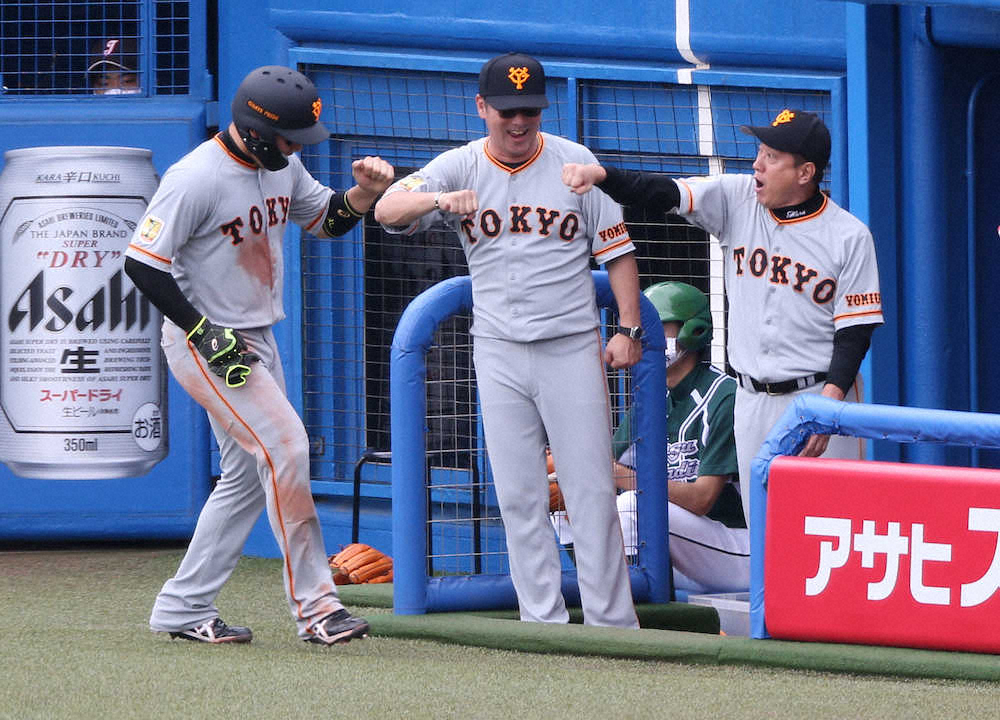 <ヤ・巨3>2回2死一、二塁、岡本の適時打で生還した二走・丸(左)を出迎える原監督(中央は元木コーチ)(撮影・吉田 剛)