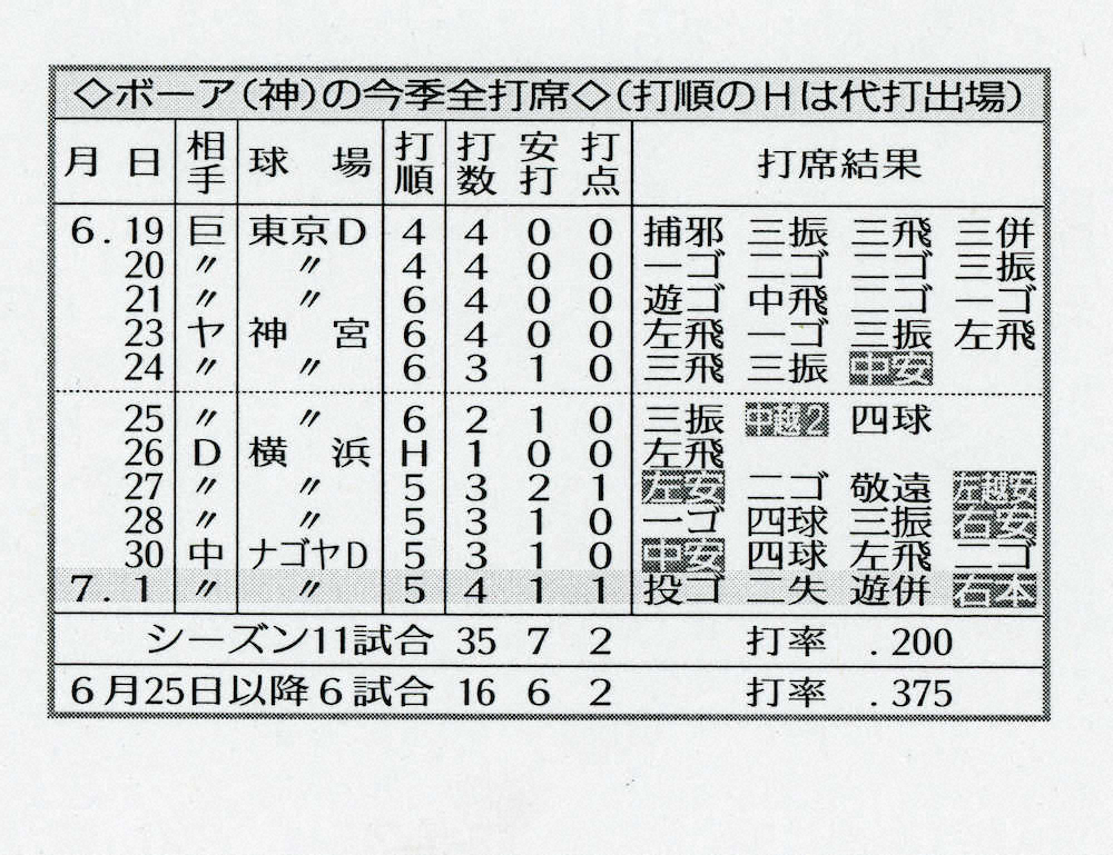 <中・神(2)>9回無死、ボーアは来日第1号となる右越えソロホームランを放つ(撮影・椎名 航) Photo by スポニチ 阪神・ボーア 39打席目で来日1号 苦手な左腕から、実戦28打席目での初安… ギャラリーで見る この記事のフォト 2020年07月02日の画像一覧 もっと見る 2020年07月02日の画像をもっと見る