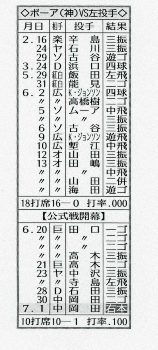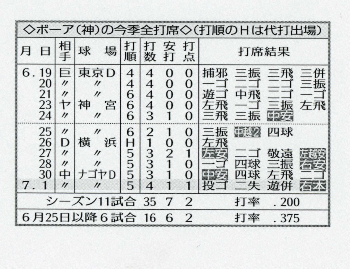 《最近6試合では打率・375》ボーア(神)が来日11試合、39打席目で待望の初本塁打。打った岡田は天敵としていた左投手で、対左腕10打席目、開幕前の実戦を含めれば28打席目の初安打を飾った。デビューから18打席連続無安打。チームの新外国人野手では83年バースの15打席を上回るワースト記録をつくったが、6月24日19打席目で初安打が出て以降は、先発した5試合すべてで安打をマーク。最近6試合で16打数6安打2打点の打率・375と調子を上げている。なお83年バースの初本塁打は12試合、23打席目。2試合後には2打席連続の2、3号を放っている。