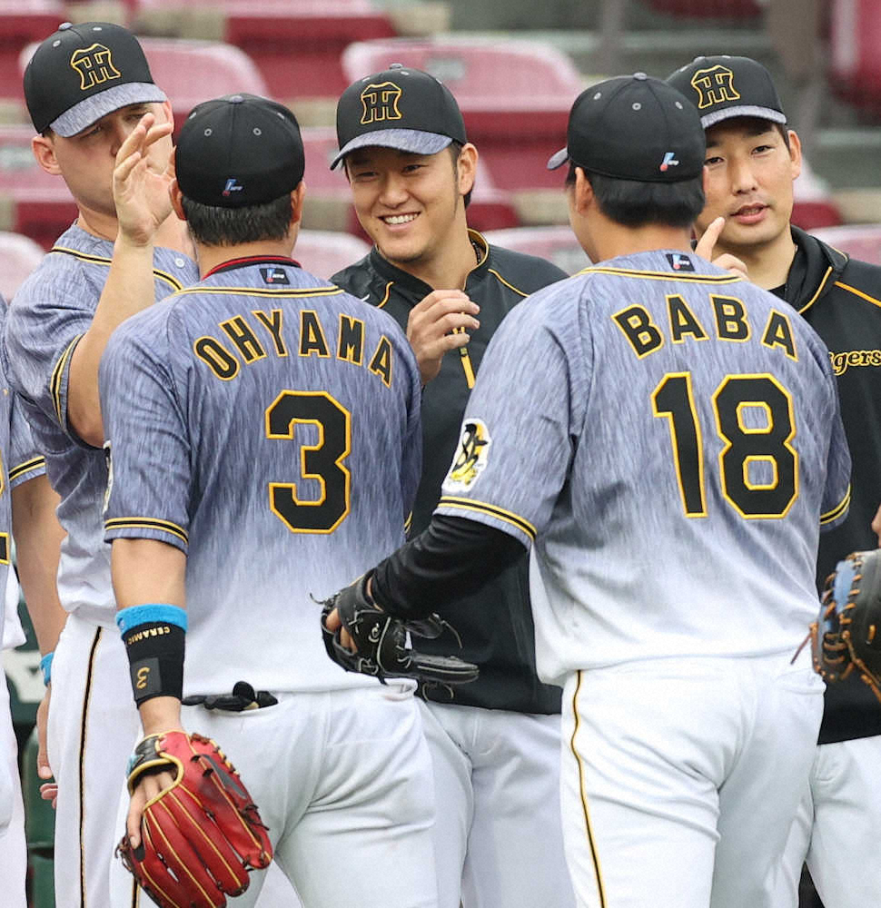 <広・神>今季初勝利を挙げ、笑顔でナインを出迎える岩貞(中央)(撮影・北條 貴史)