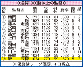 巨人・原監督 ミスターに並ぶ1034勝に「光栄でございます」 球団最多川上氏にあと32
