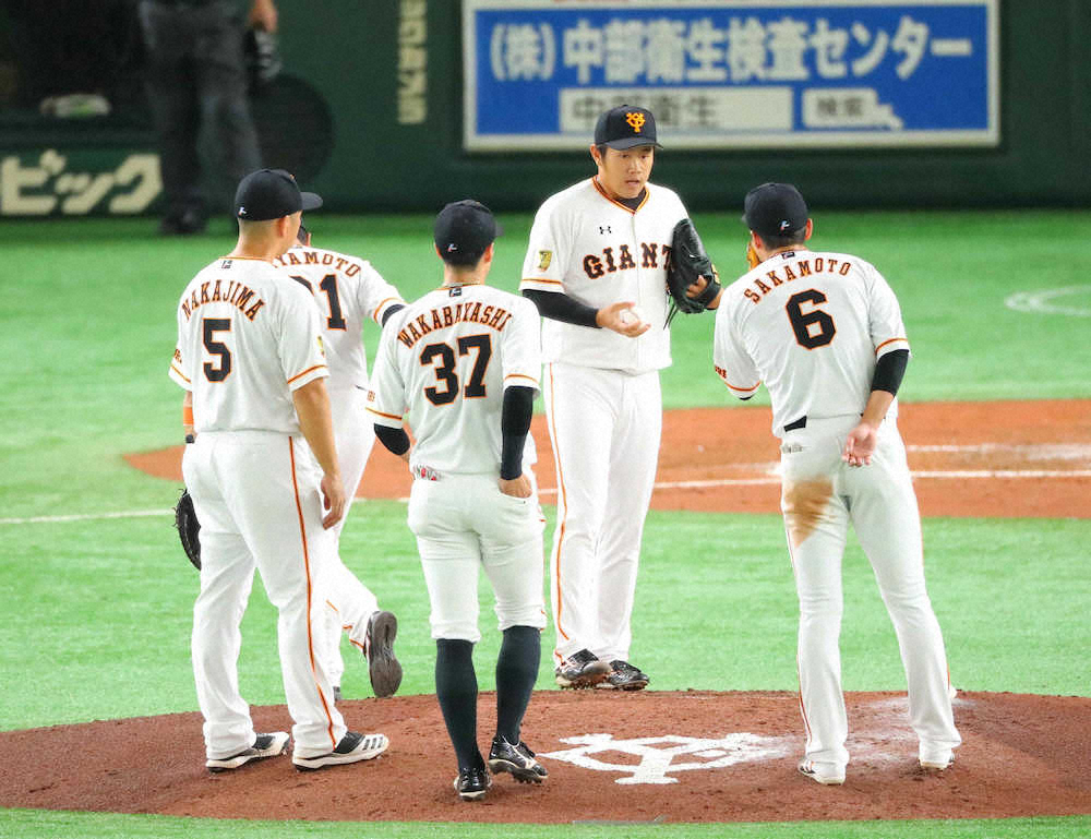 <巨・中>3回無死二塁、急きょ登板となった堀岡(中央右)(撮影・木村 揚輔)