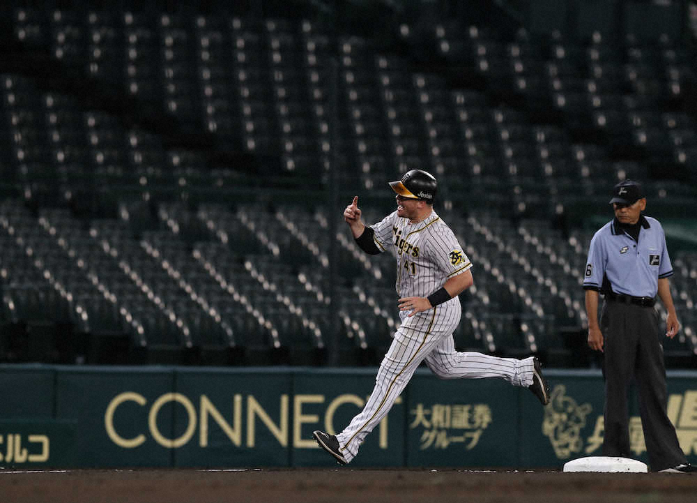 0―0で迎えた7回だ。右前打の大山を一塁においた場面で、メルセデスの2球目、高めスライダーをフルスイング。高く上がった打球は中堅右のフェンスを軽く越えていき、無人のスタンドではねた。5日の広島戦以来(マツダ)から2試合連発。本拠地・甲子園では公式戦初の一発で、均衡を破った。