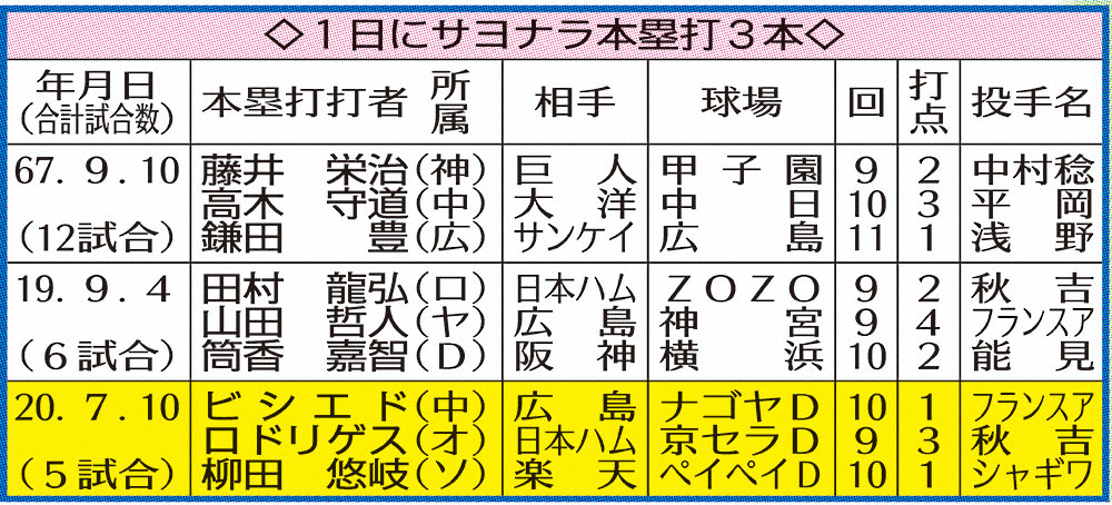 <ソ・楽>10回、柳田が中越えにサヨナラ本塁打を放つ(撮影・岡田 丈靖 Photo by スポニチ 史上3度目、1日にサヨナラ本塁打3本!全て1点差決着は3年ぶり ギャラリーで見る この記事のフォト 2020年07月11日の画像一覧 もっと見る 2020年07月11日の画像をもっと見る