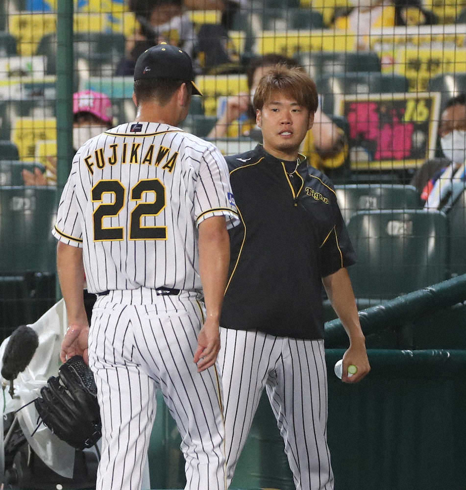 <神・D>9回表終了後、藤川(左)を出迎える西勇(撮影・坂田 高浩)