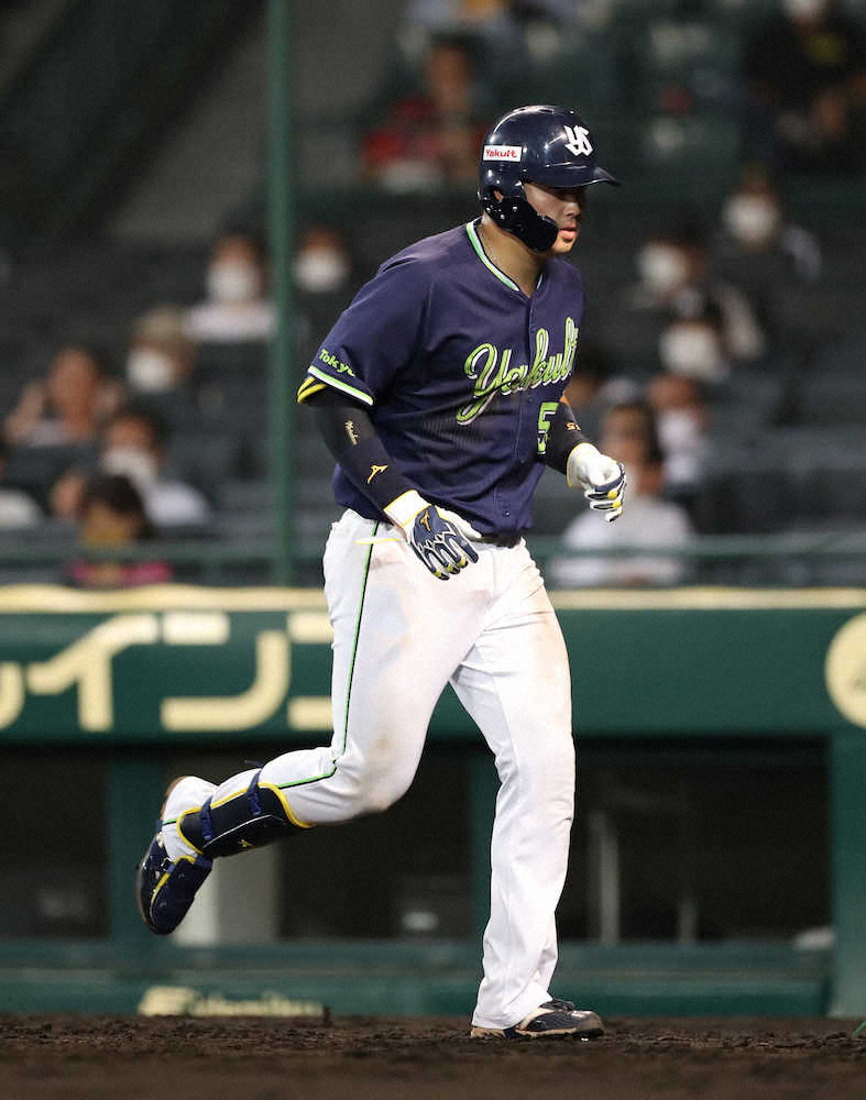 <神・ヤ>5回無死、中前打を放つも、代走を送られて交代する村上(撮影・坂田 高浩)
