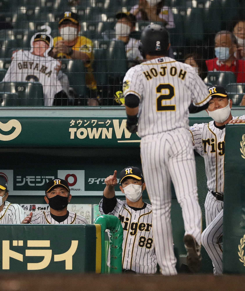 <神・中>4回1死満塁、サンズの押し出し四球で生還した代打の北條(2番)を迎える矢野監督(中央)(撮影・坂田 高浩)