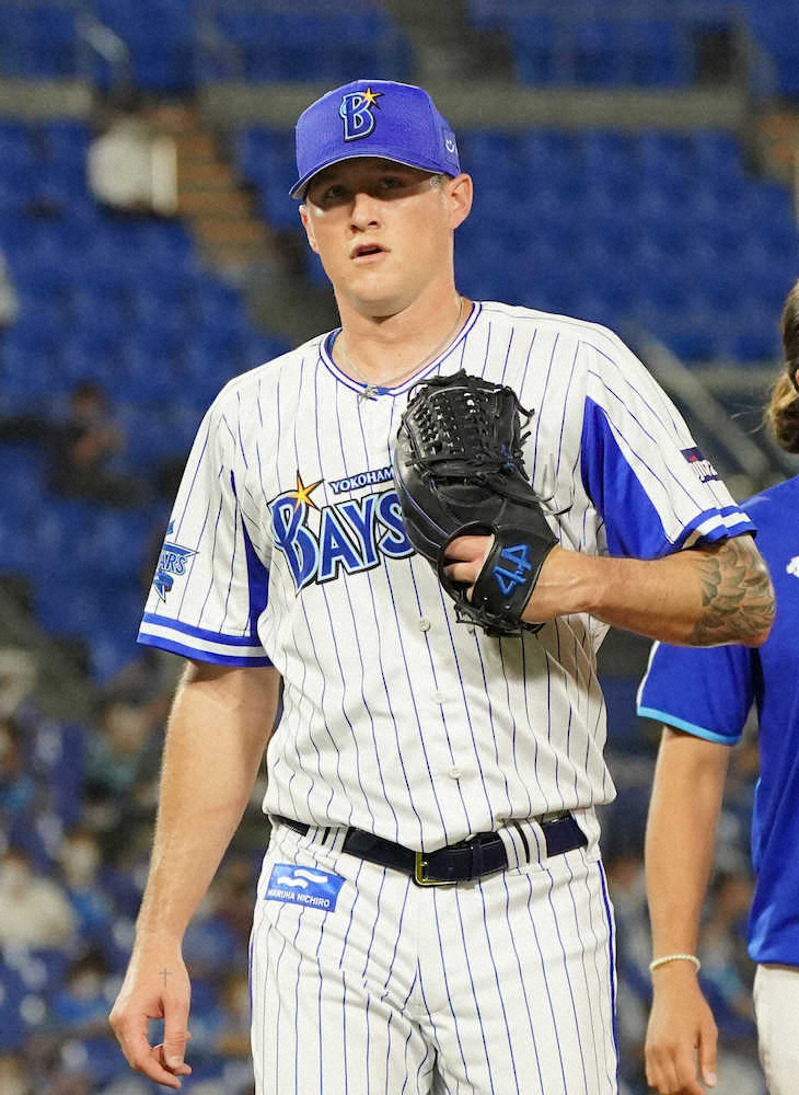 しかし勝利投手の権利が懸かった5回だった。先頭の坂口の中前打、山田哲の左前打で一、二塁のピンチを背負った。続く青木にはツーシームを捉えられ左中間を破る適時二塁打、さらに村上に右翼線への適時二塁打を浴びると、ラミレス監督はベンチを出て投手交代を告げた。