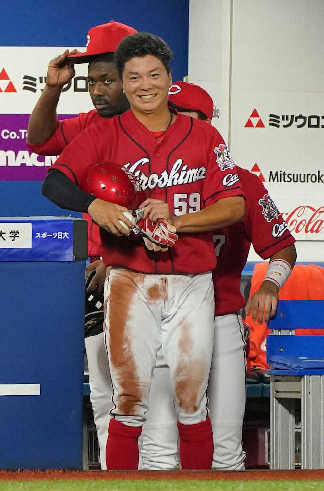 <D・広>プロ初安打を放った大盛はベンチで笑顔(撮影・島崎忠彦)