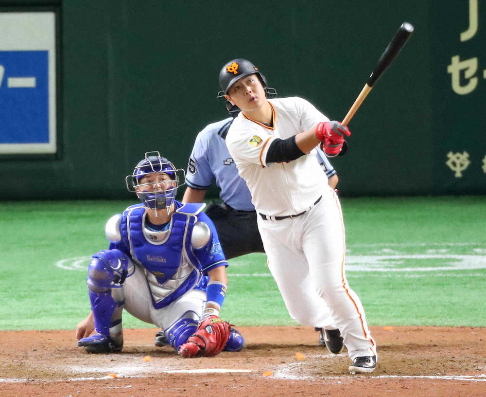 巨人岡本和真内野手(24)が、30日のDeNA戦の9回に看板直撃のセ・リーグ単独トップとなる13号ソロ本塁打を放った。