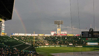 雨上がりの甲子園に虹…阪神―DeNA、にわか雨で試合開始遅れる