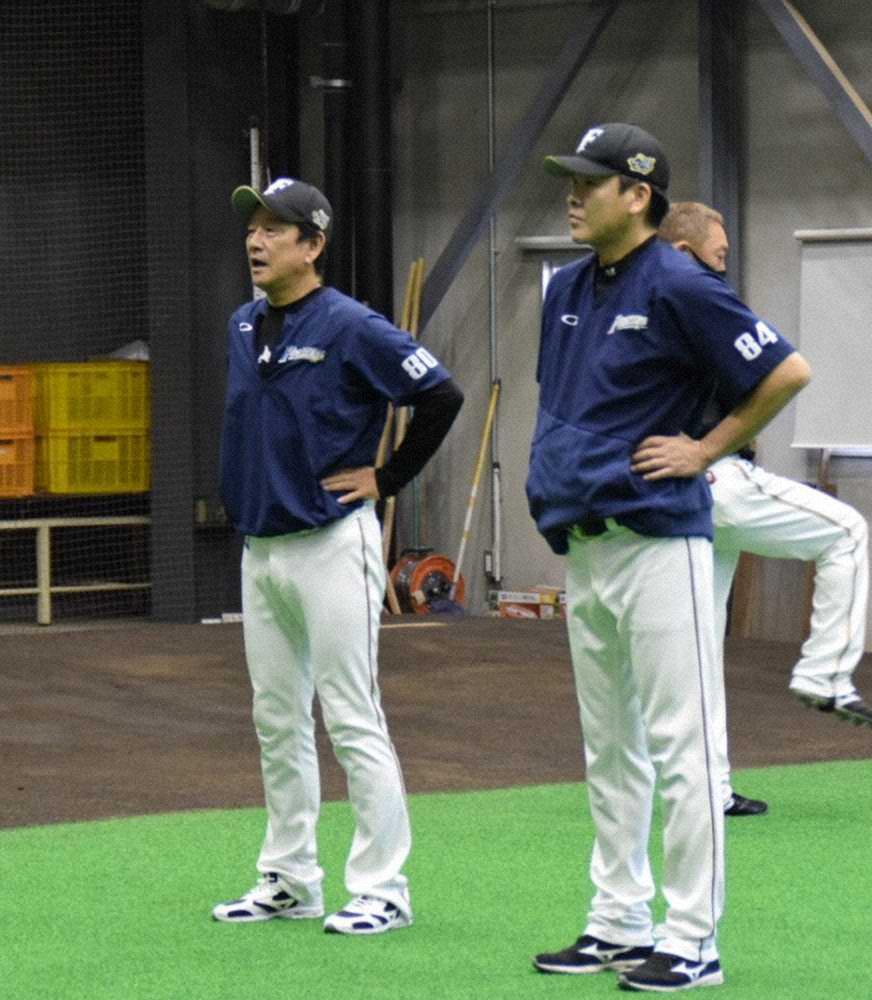 札幌市内の室内練習場で行われた全体練習を視察する日本ハム・栗山監督(左)。右は厚沢ベンチコーチ兼投手コーチ