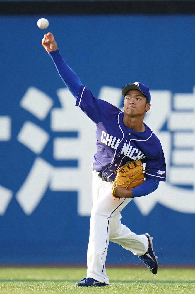 <D・中>試合前のシートノックでライトから返球する根尾(撮影・会津 智海)