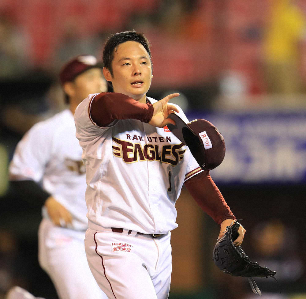 <楽・ソ>3回を投げ終え、汗を拭いながらベンチへと戻る楽天・松井裕 (撮影・白鳥 佳樹)
