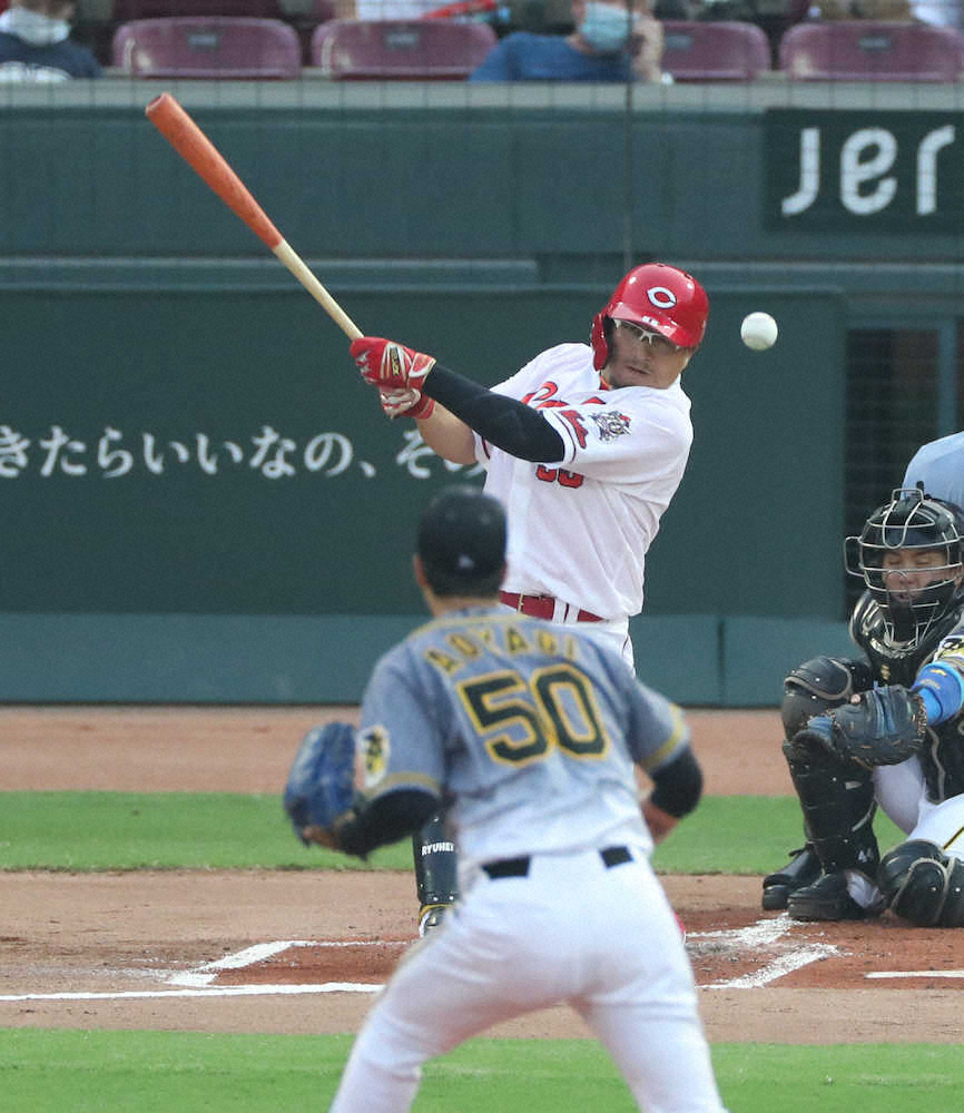 松山は前日までの5番から打順を上げ「4番・一塁」で先発出場。初回、2死二塁で入った第1打席で阪神先発右腕・青柳が1ボールから投じた2球目、内角の141キロ直球を中前に弾き返して先制点を叩き出した。1番・西川が四球で出塁。この日、1軍に初昇格し、「2番・二塁」でいきなりスタメンデビューとなった高卒2年目の羽月がプロ初打席できっちり送りバントを決めて作ったチャンスを逃さなかった。