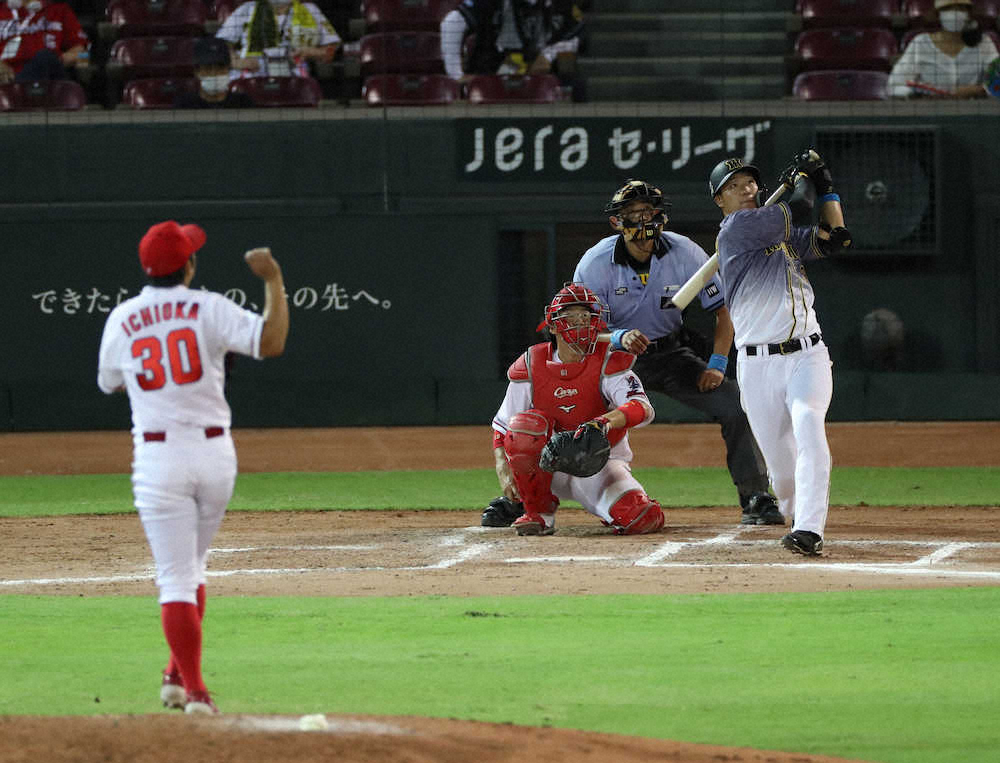 1点差の接戦で迎えた8回2死走者なし。広島4番手・一岡の初球、甘く入ったスライダーを一振りで仕留めた。左翼・長野も見送るだけの打球がスタンドに着弾。この日3本目の安打は、自身3年連続となる2桁10号本塁打でチームに大きな1点をもたらした。