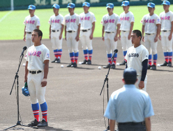 花咲徳栄と2校のみで行った開会式。井上主将と共同での選手宣誓の文章は自分で考えた。新型コロナウイルスだけでなく、7月に九州などを襲った豪雨災害にも触れた。「苦しんでいる人が身近にいる。勇気を与えたかった」。自身も中学3年の秋に交通事故で頭蓋骨骨折などの大ケガを負い、生死をさまよう経験をしている。苦難を乗り越え、聖地のマウンドで149球を投げ抜いた。