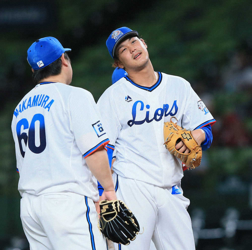 <西・楽>6回途中、降板する高橋光(右)(撮影・尾崎 有希)