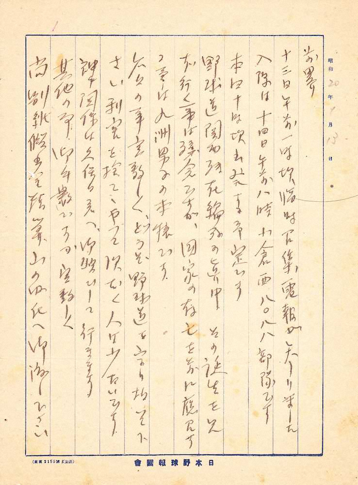 <前略 十三日午前一時頃、臨時召集電報が参りました>と阪急軍マネジャーで交流の深かった益田秀高に宛てて書いた手紙が残る。<入隊は十四日午前八時、小倉西八〇八八部隊です。本日十時頃出発する予定です>。出征当日の1月13日に書かれたものだ。