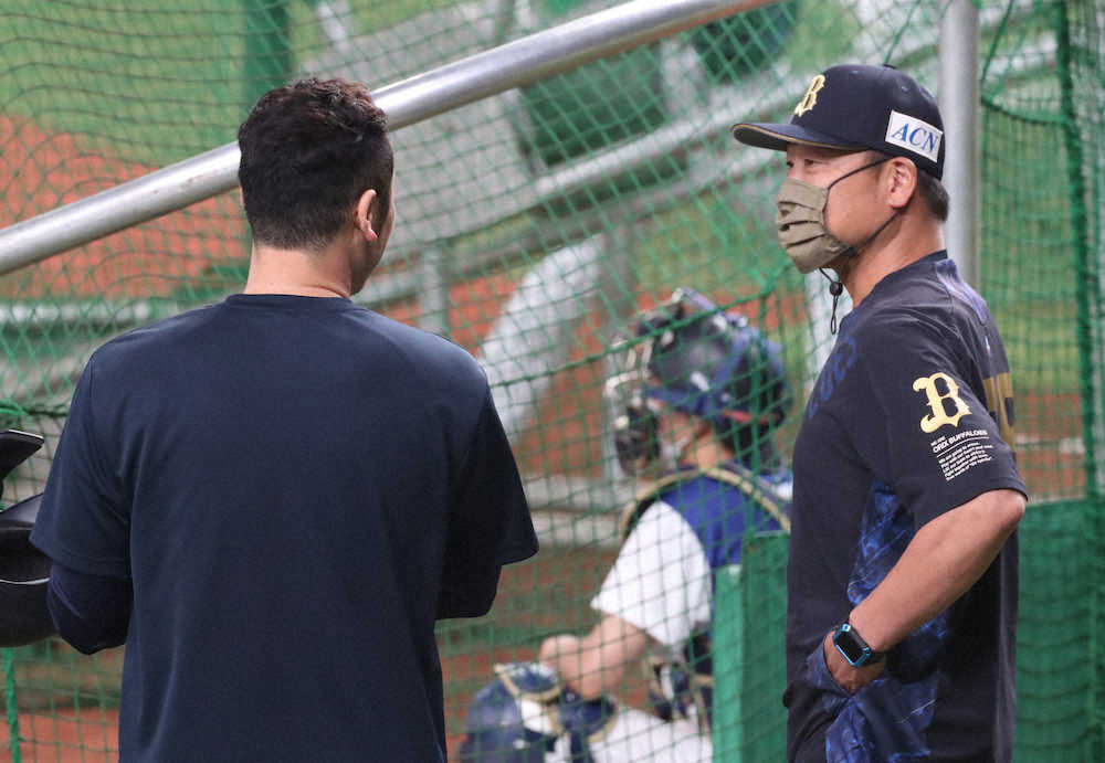 <オ・西(10)>Tー岡田(左)と話す中嶋監督代行 (撮影・平嶋 理子)