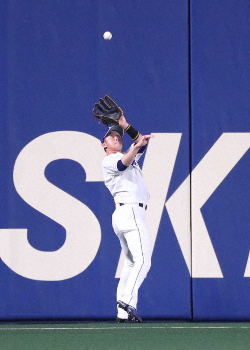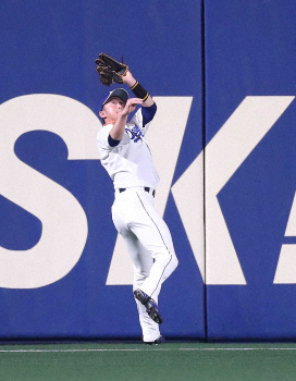9回から守備固めで左翼を守ると、無死一塁から佐野の大飛球が飛んできた。背走しながら、懸命にグラブを伸ばし、フェンス手前でキャッチ。「打球が自分が思ったより切れながら伸びてきたので、危なかったですが何とか捕ることができました」と笑みを浮かべた。