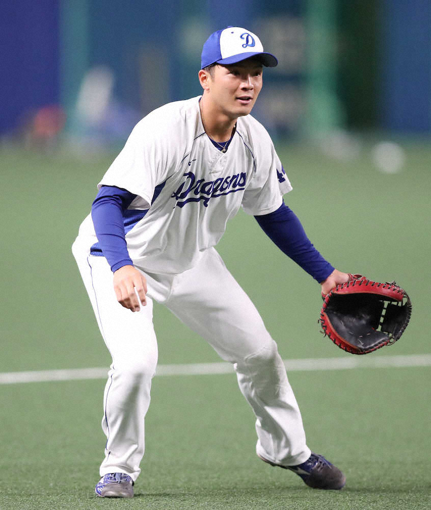 ノックを受け、笑顔の中日・郡司(撮影・椎名 航)
