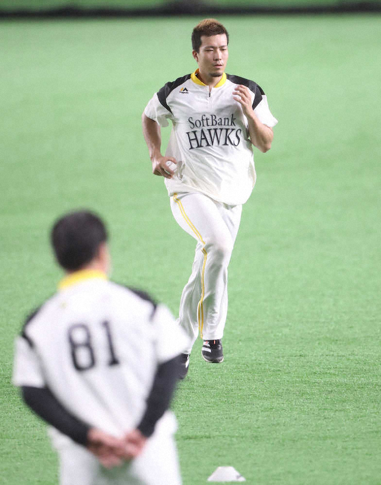 工藤監督(手前)が見守る前でダッシュする千賀(撮影・岡田 丈靖)