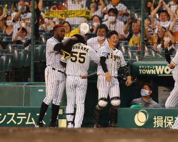 <神・中(11)>バナナのおもちゃを手に陽川(55)を出迎えるガルシア(中央)(撮影・北條 貴史) Photo by スポニチ “赤髪変身”阪神・ガルシア 甲子園通算13度目の先発で初勝利 陽川には感… ギャラリーで見る この記事のフォト 2020年08月27日の画像一覧 もっと見る 2020年08月27日の画像をもっと見る