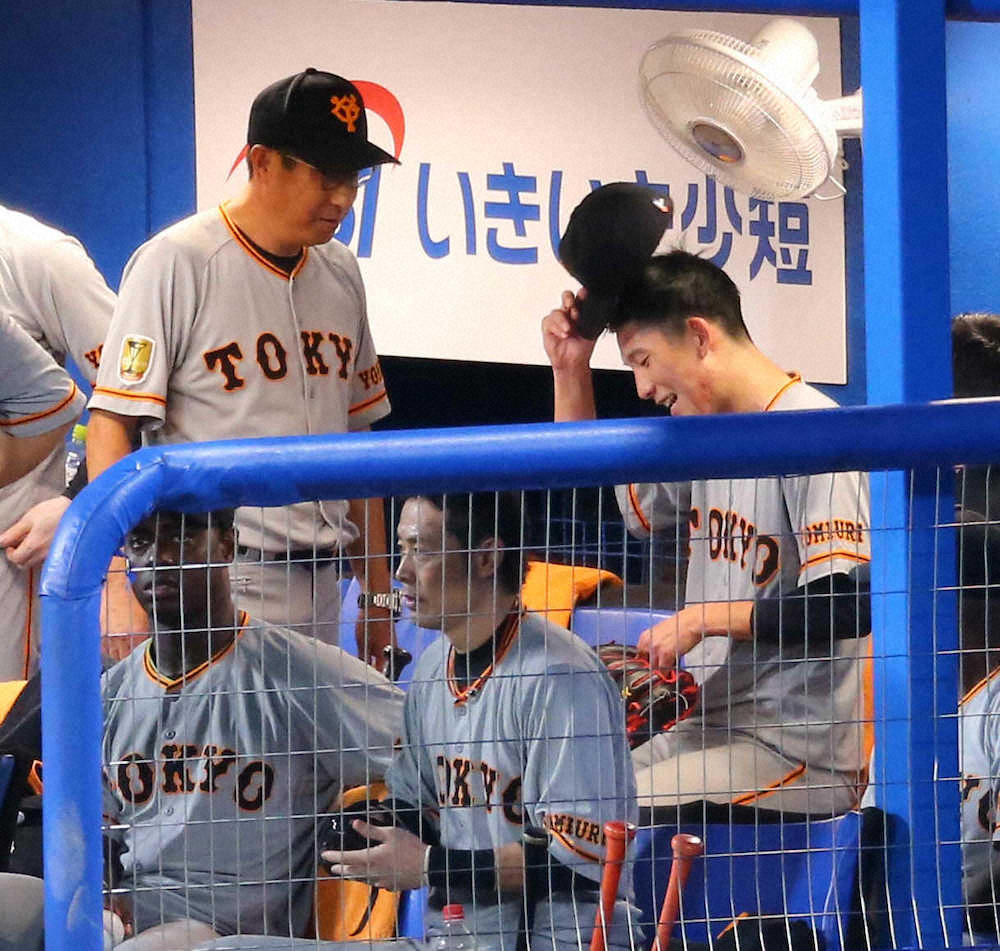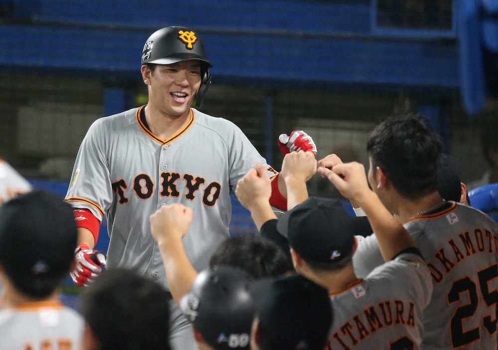 <ヤ・巨>5回2死一塁、岡本が適時二塁打を放ち、盛り上がる戸郷(右)ら巨人ナイン(撮影・木村 揚輔)