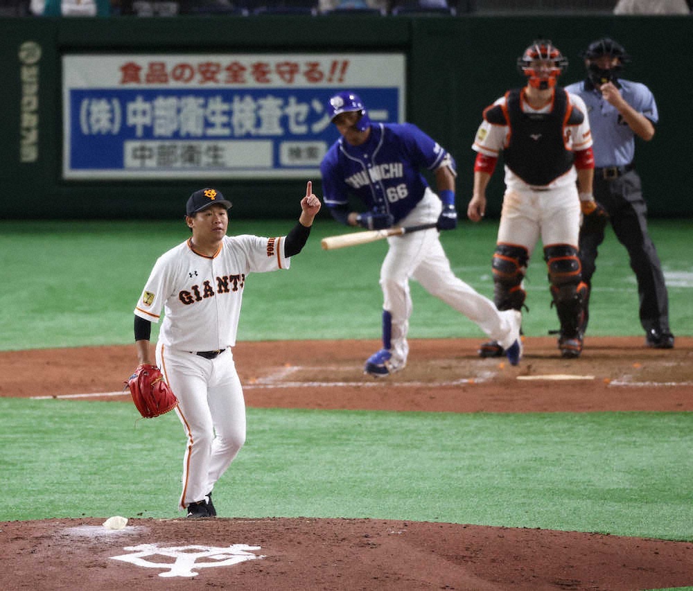 <巨・中>5回2死一、二塁、ビシエド(左から2人目)を遊飛に打ち取る田口(撮影・小海途 良幹)