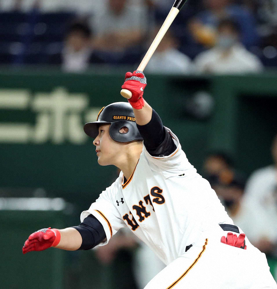 <巨・中>4回1死三塁 先制の中越え適時二塁打を放つ岡本(撮影・久冨木 修)