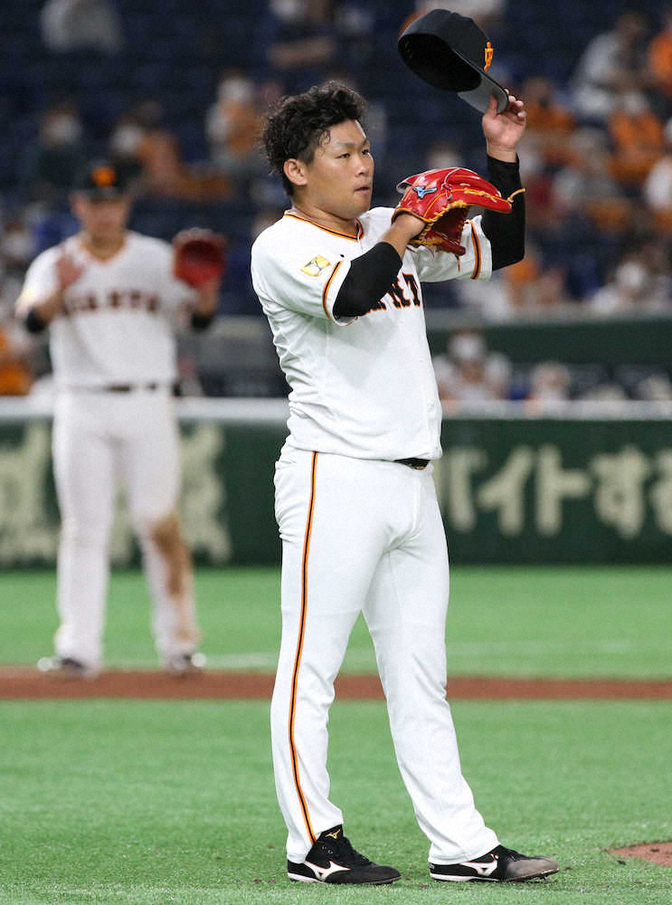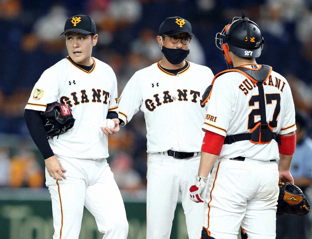 <巨・中>6回2死一、三塁 降板する鍵谷(左)(撮影・久冨木 修)