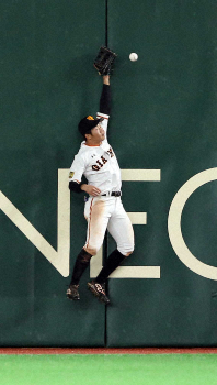 <巨・中>6回1死一、三塁 堂上の打球に松原がジャンプするも及ばず適時二塁打になる(撮影・久冨木 修)