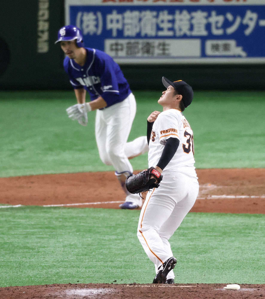 <巨・中>7回1死一、二塁、阿部(左)に適時二塁打を打たれ顔をしかめる鍵谷(撮影・小海途 良幹)